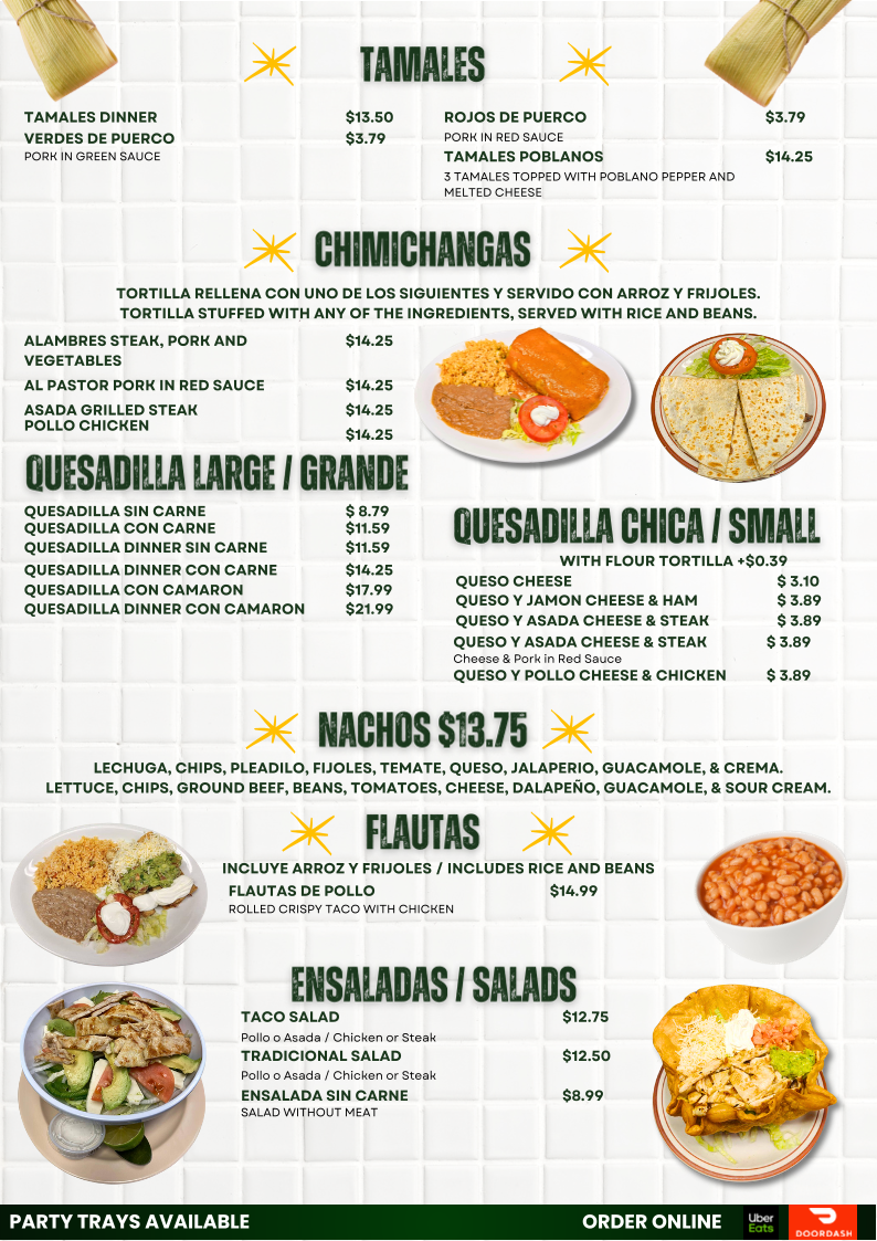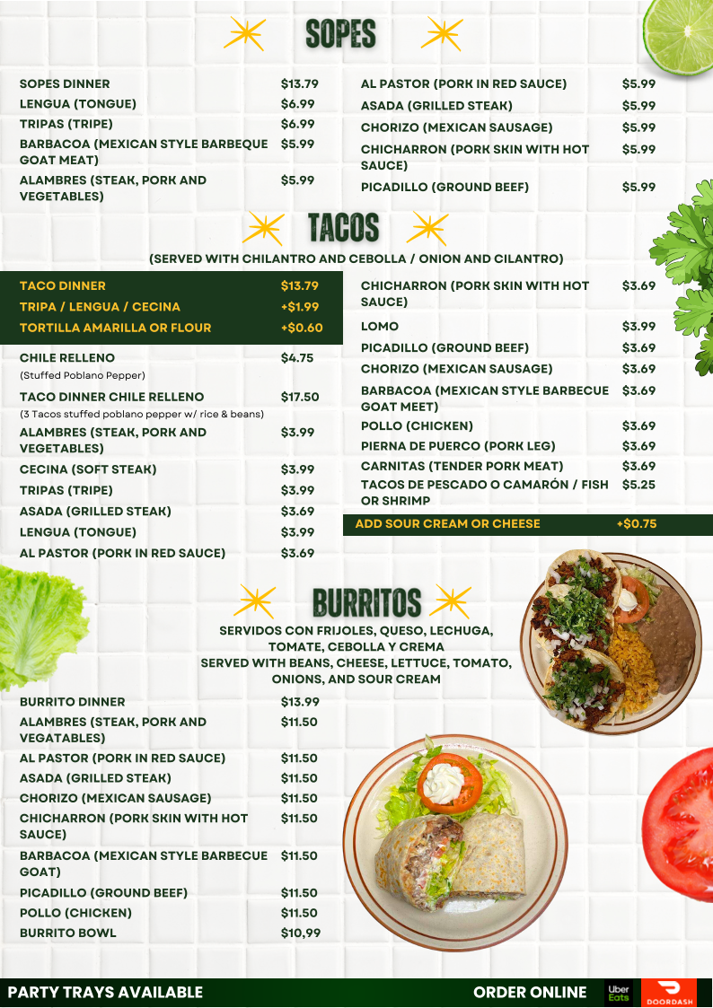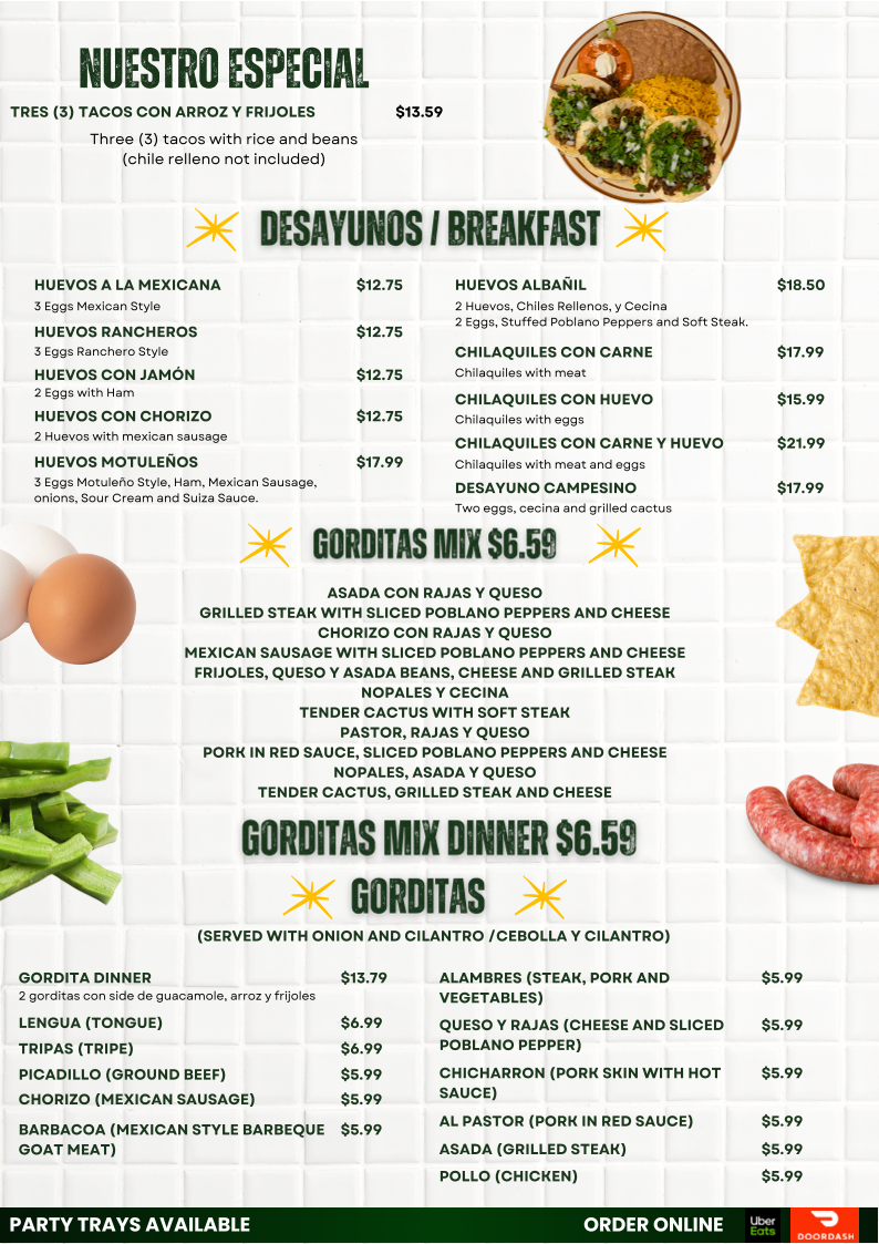 The menu, a generous 6-page spread, brims with delicious options. You can savor the tantalizing Tacos, where each taco offers a choice of tender meats—be it succulent carnitas or perfectly spiced grilled veggies—all cradled in fresh, handmade tortillas that truly elevate each bite. A standout option is the Three Taco Dinner for just $13.59, perfect if you want to sample a variety of flavors.